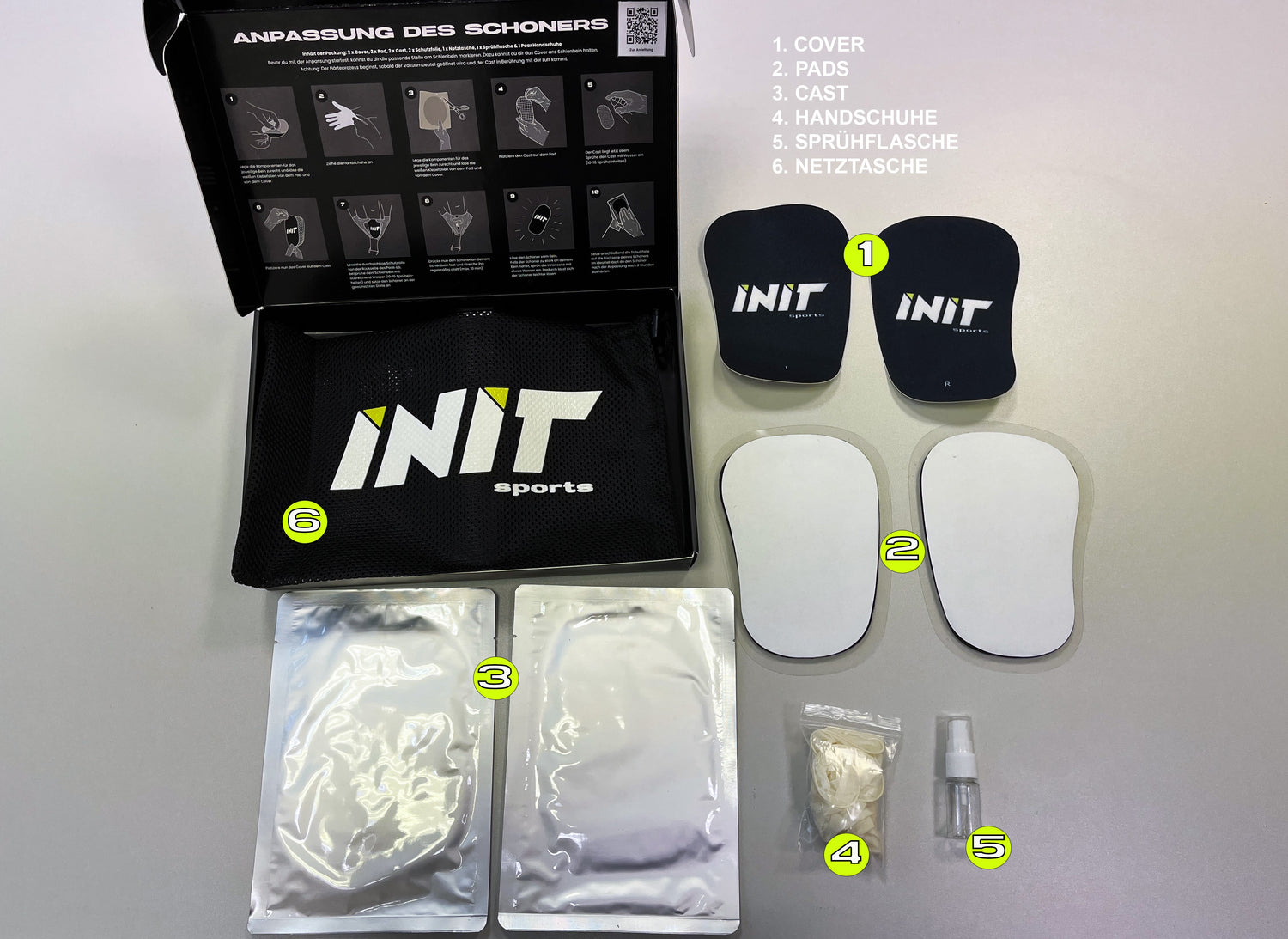 - Place the layers appropriately on top of each other. The pad comes down with the care foil and the cast is placed on it. Now spray the cast with 5-10 sprays of water and place the INIT cover on the cast.